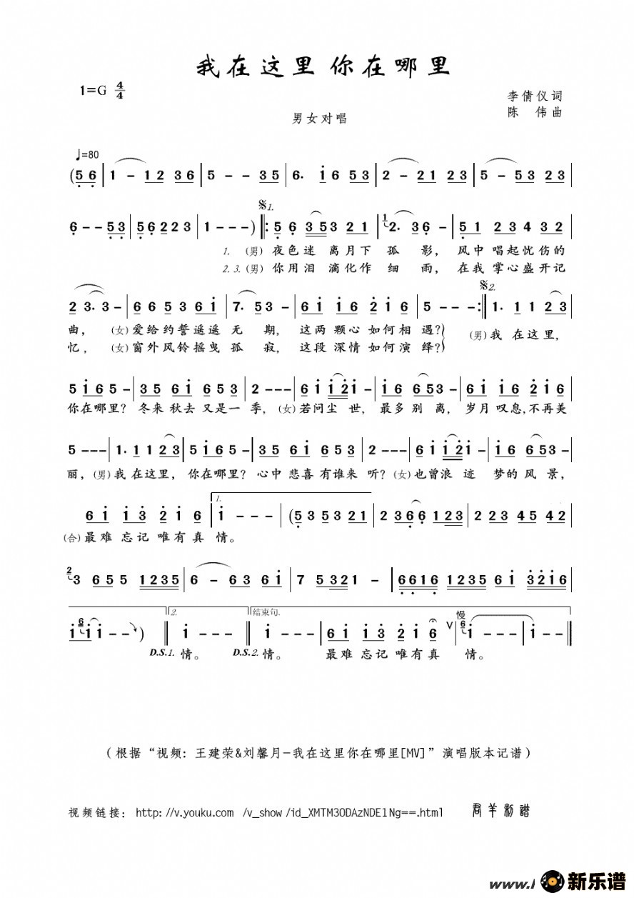 《我在这里 你在哪里》最新曲谱 王建荣、刘馨月-君羊制谱