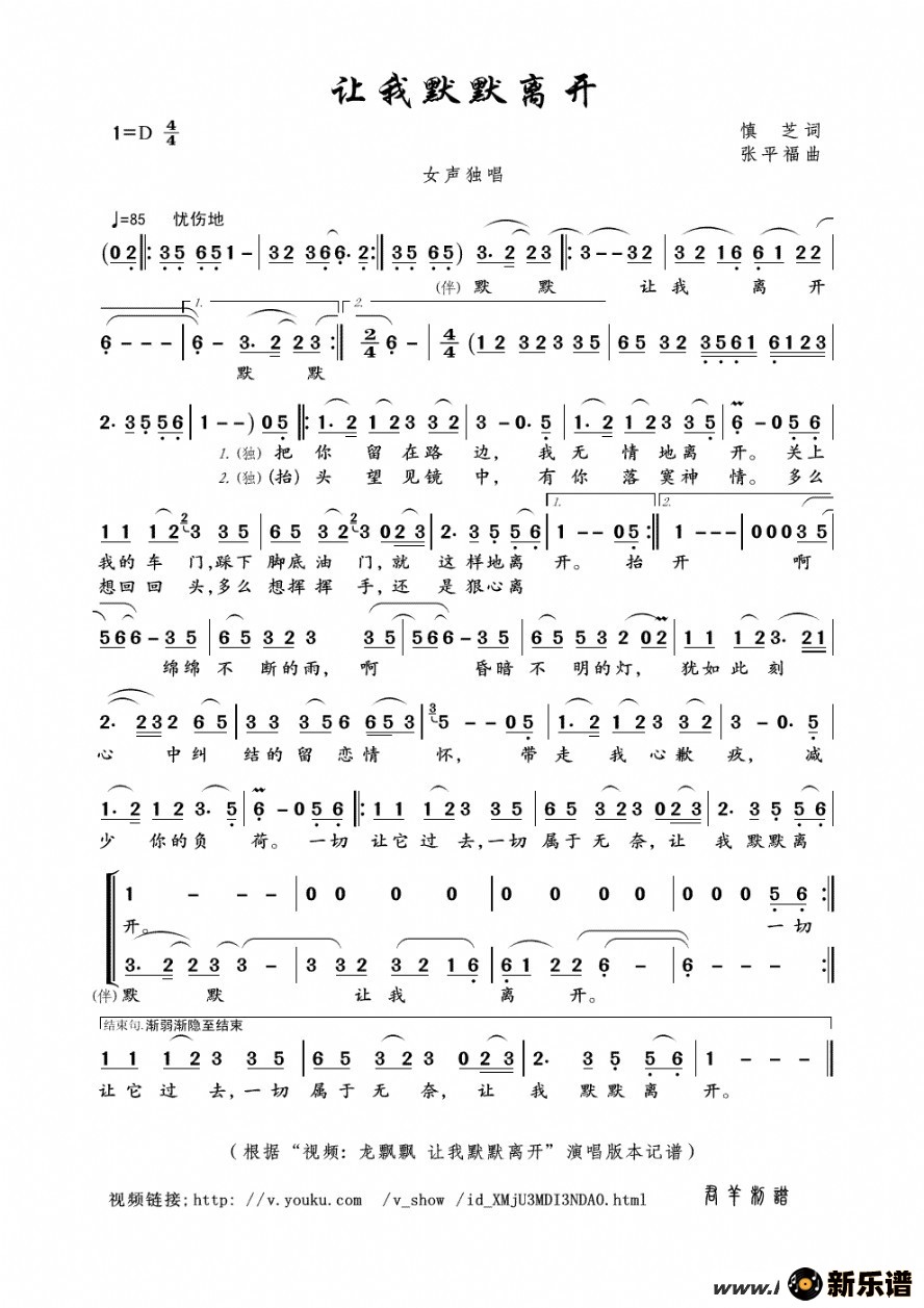 让我默默离开龙飘飘 龙飘飘演唱的让我默默离开歌词,让我默默离开最新曲谱. (助唱)啊……把你留在路边我无情地离开关上我的车门踩下脚底油门就这样地离开抬头望见镜中有你落寞神情多么想回回头多么想挥挥手还是狠心离开啊……连绵不断的雨啊……昏暗不明的灯犹如此刻心中纠结的留恋情怀带走我的歉疚减少你的负荷一切让它过去一切属于无奈让我默默离开 此最新曲谱由新乐谱会员 君羊 上传