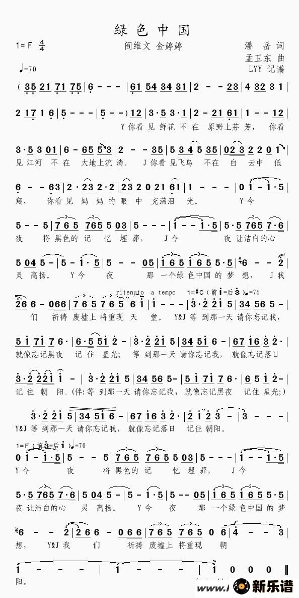 阎维文/金婷婷演唱的绿色中国歌词,绿色中国最新曲谱.