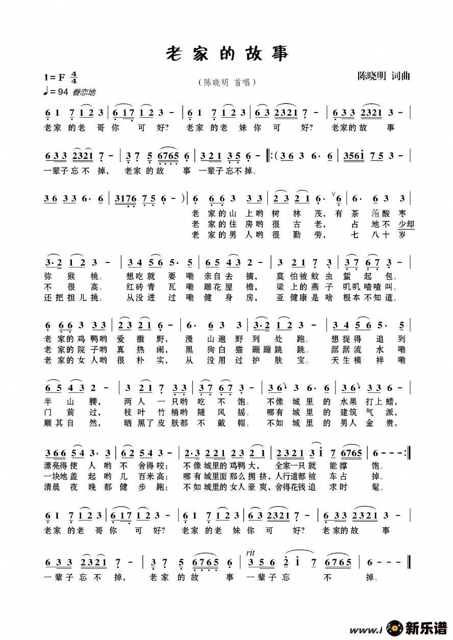 陈晓明演唱的老家的故事歌词,老家的故事最新曲谱.