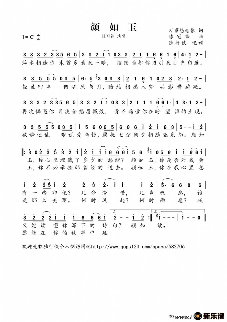 《颜如玉》最新曲谱 陈冠锋-独行侠制谱