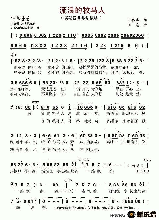 《流浪的牧马人》最新曲谱 苏勒亚其其格-秋叶起舞制谱