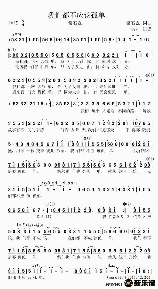 《我们都不应该孤单》最新曲谱 常石磊-momoliu制谱
