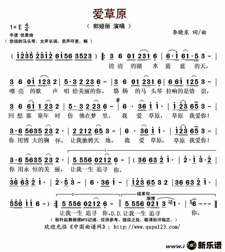 郭娅丽演唱的爱草原歌词,爱草原最新曲谱.