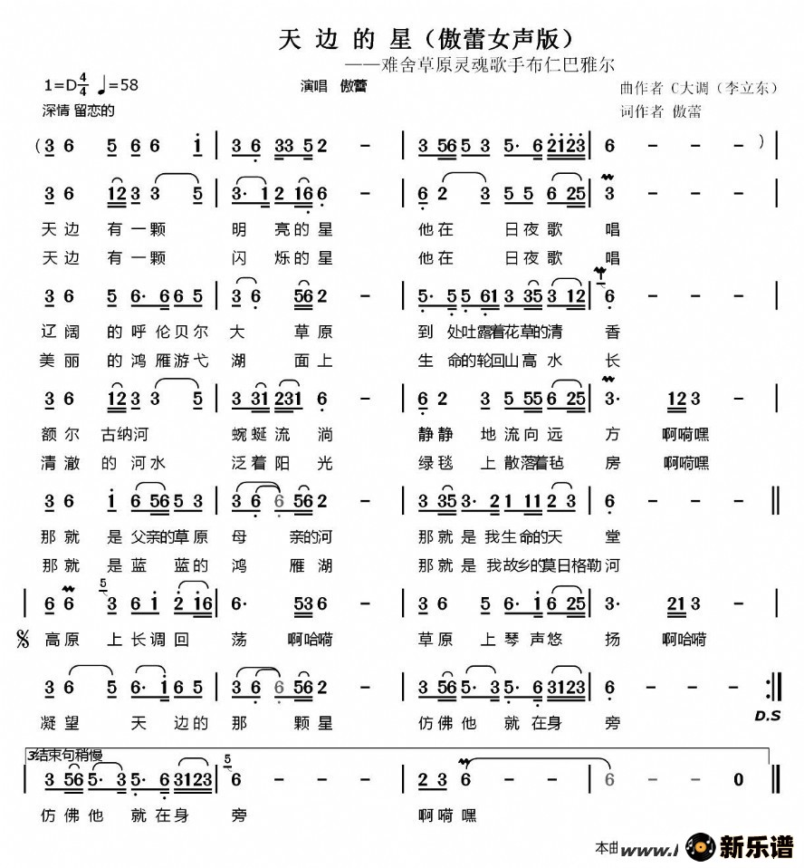 傲蕾演唱的天边的星歌词,天边的星最新曲谱.