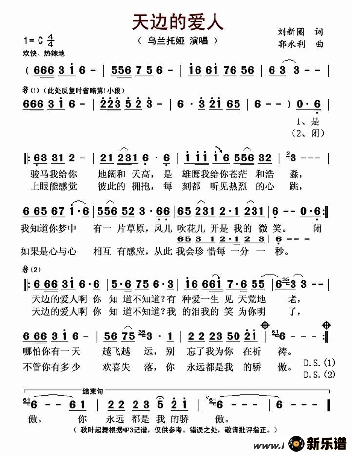 乌兰托娅演唱的天边的爱人歌词,天边的爱人最新曲谱.