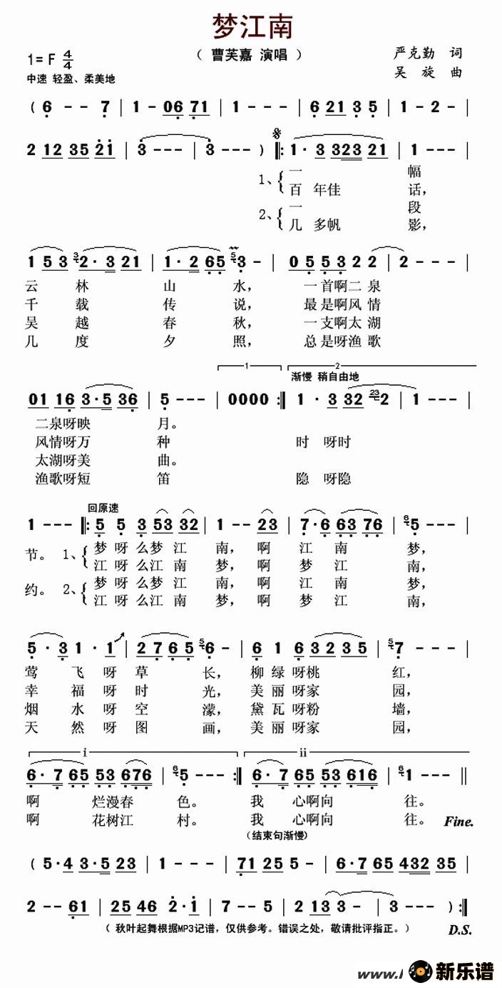 曹芙嘉演唱的梦江南歌词,梦江南最新曲谱.