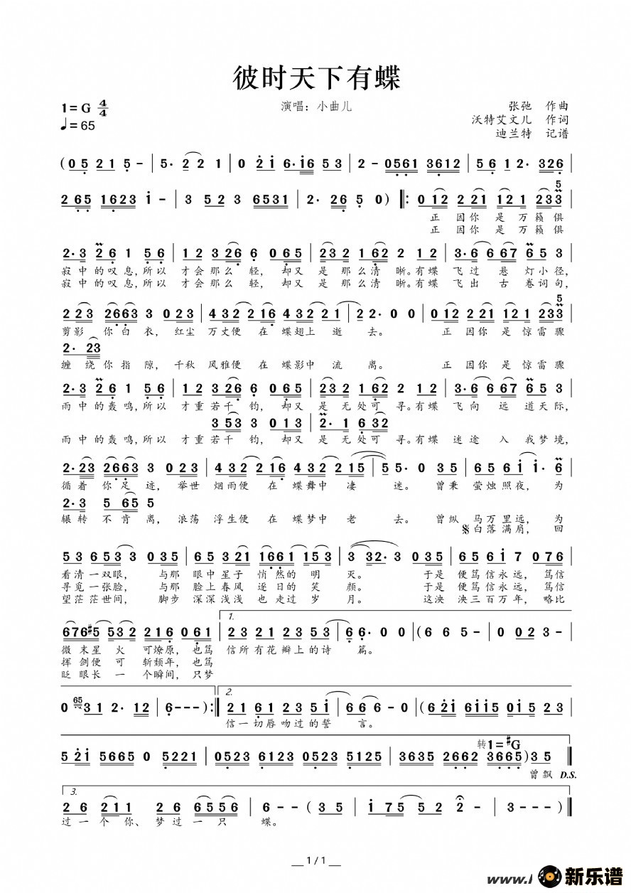 《彼时天下有蝶》最新曲谱 小曲儿