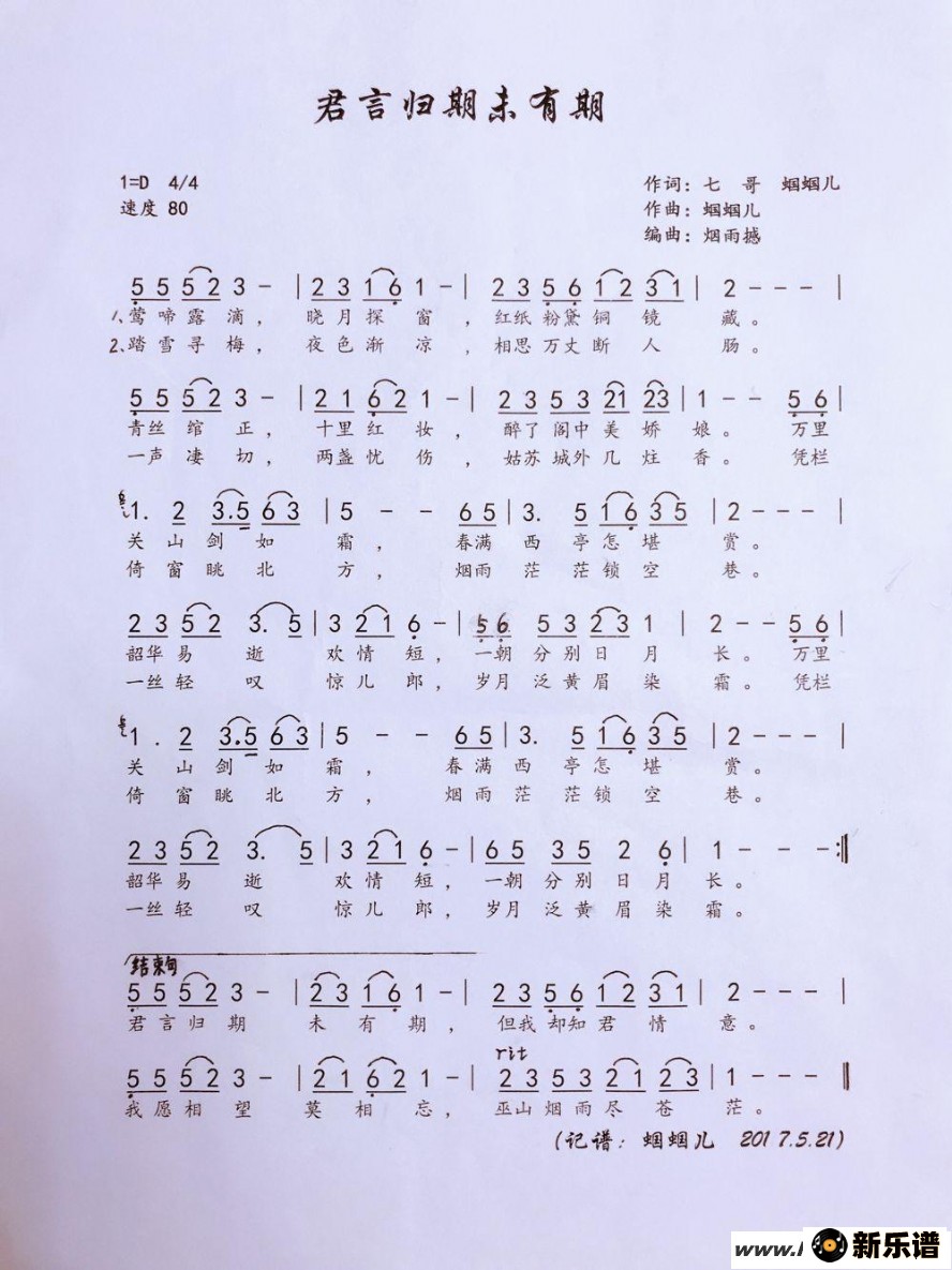 蝈蝈儿演唱的君言归期未有期歌词,君言归期未有期最新曲谱.