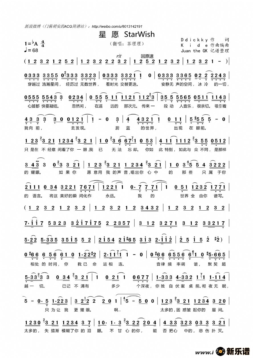 茶理理演唱的星愿starwish歌词,星愿starwish最新曲谱.