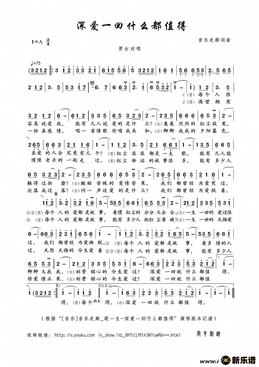 音乐走廊、歌一生演唱的深爱一回什么都值得歌词,深爱一回什么都值得最新曲谱.