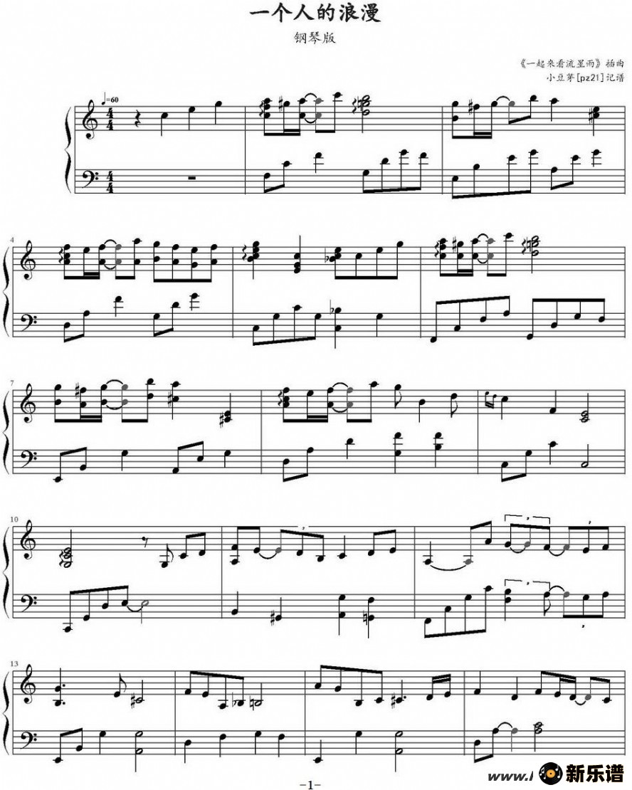 > 一个人的浪漫(《一起来看流星雨》插曲)最新曲谱