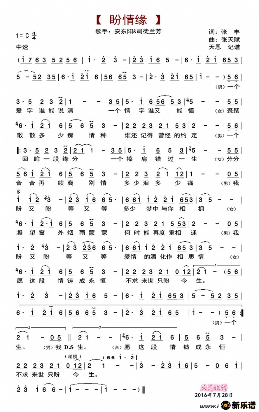 《盼情缘》最新曲谱 安东阳/司徒兰芳-天恩制谱