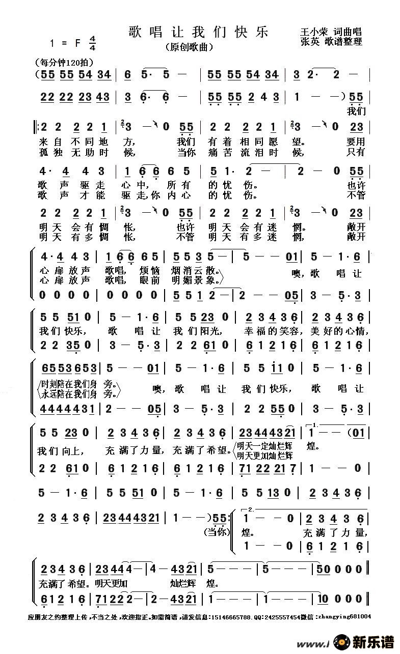王小荣演唱的歌唱让我们快乐歌词,歌唱让我们快乐最新曲谱.