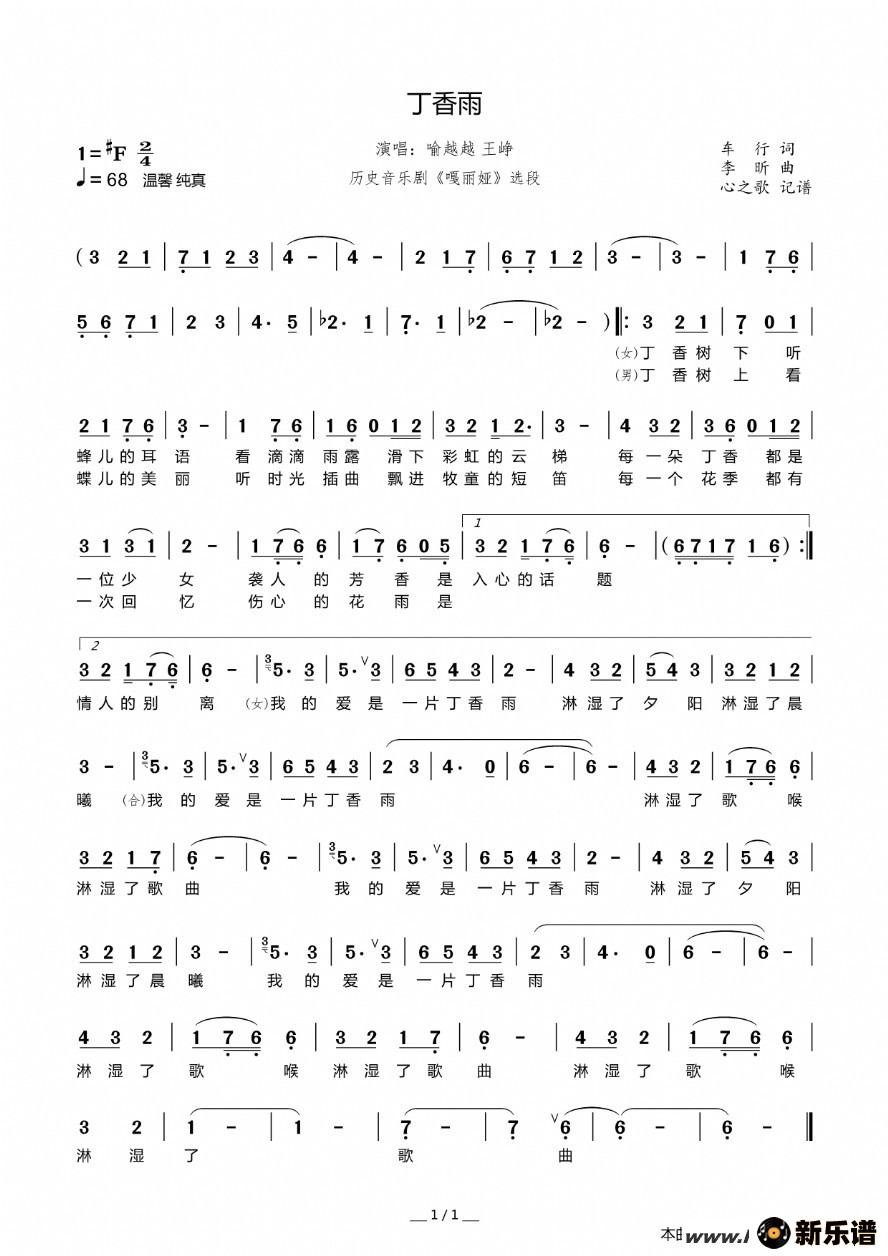 《丁香雨》最新曲谱 喻越越/王峥-心之歌制谱