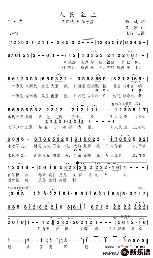 《人民至上》最新曲谱 王丽达/汤子星-momoliu制谱