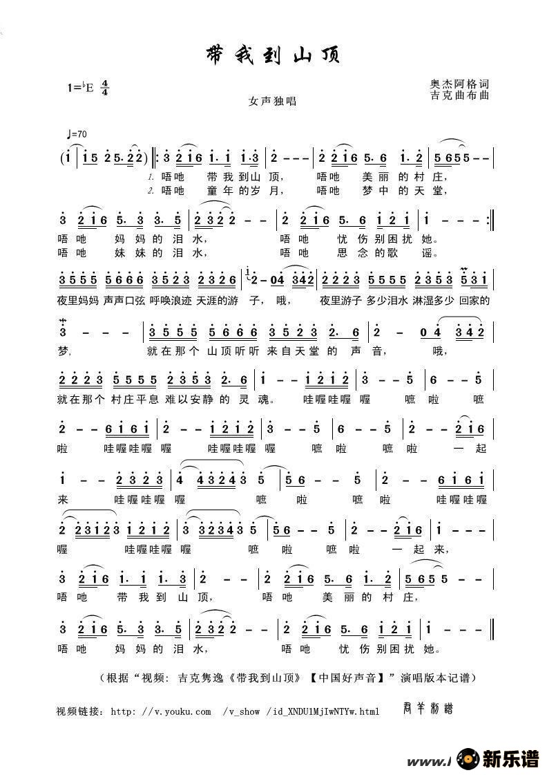 《带我到山顶》最新曲谱 吉克隽逸-君羊制谱