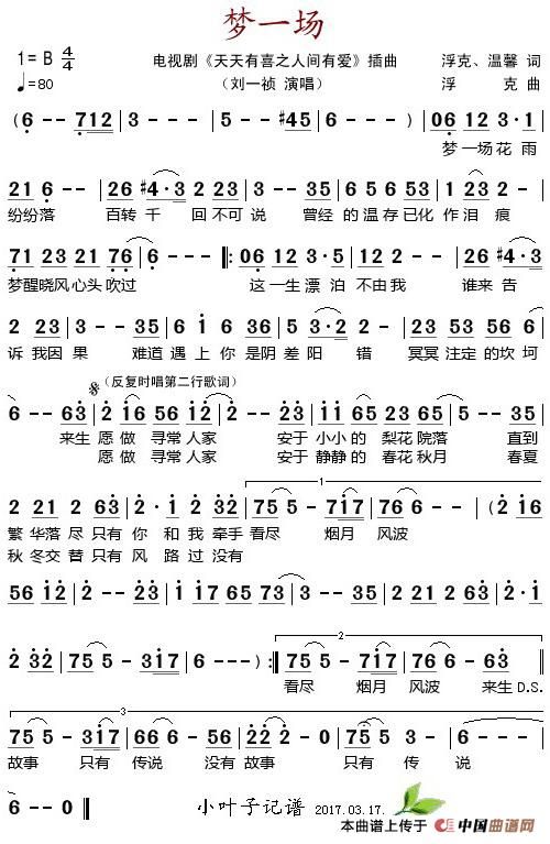 《梦一场(电视剧《天天有喜之人间有爱》插曲)》最新曲谱 刘一祯-小叶子制谱