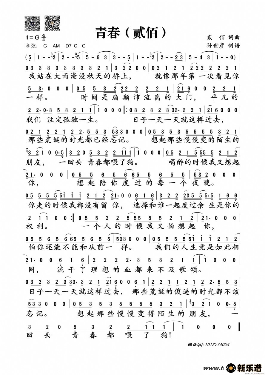 《青春》最新曲谱 贰佰-孙世彦制谱