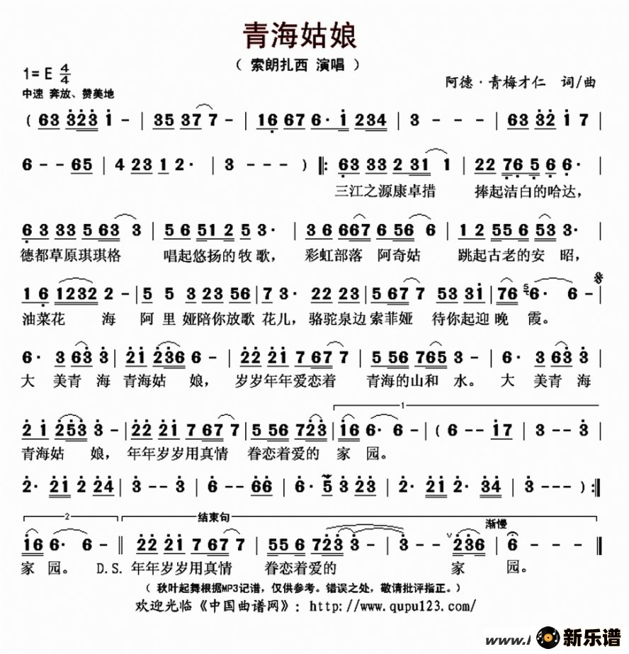 《青海姑娘》最新曲谱 索朗扎西-秋叶起舞制谱