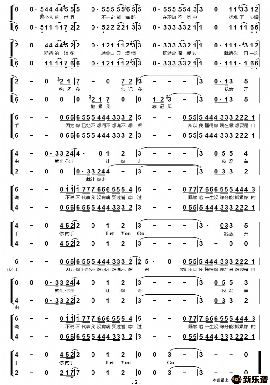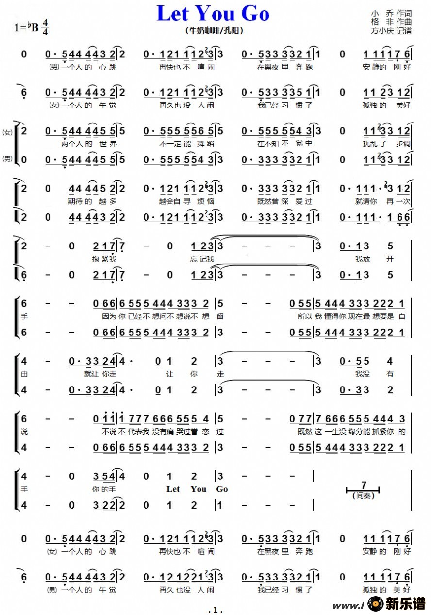 《let you go》最新曲谱 牛奶咖啡/孔阳