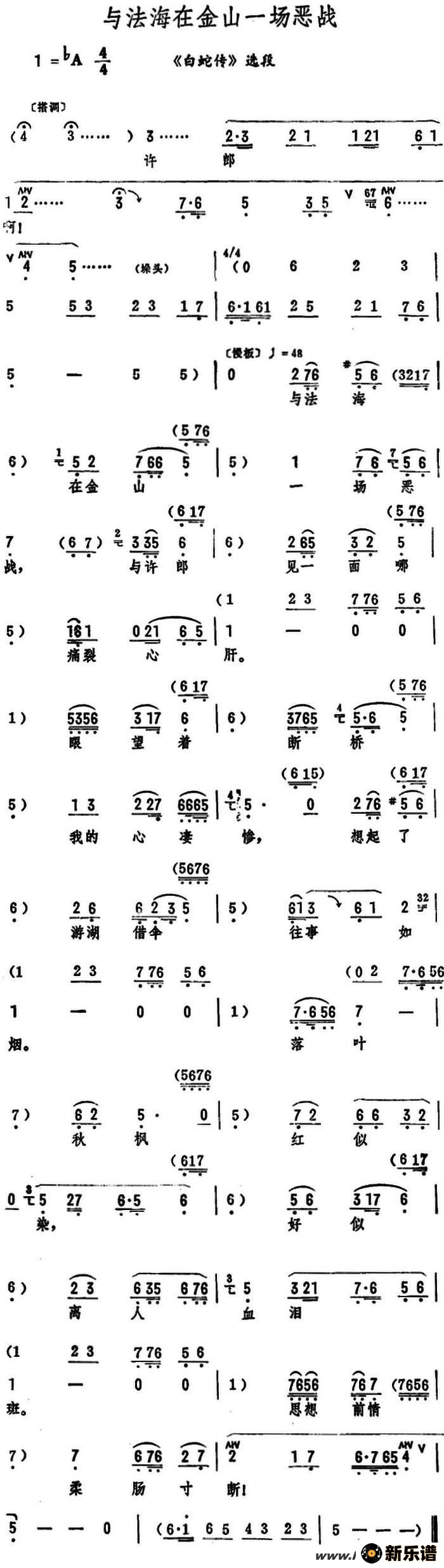 筱俊亭演唱的与法海在金山一场恶战歌词,与法海在金山一场恶战最新曲谱.