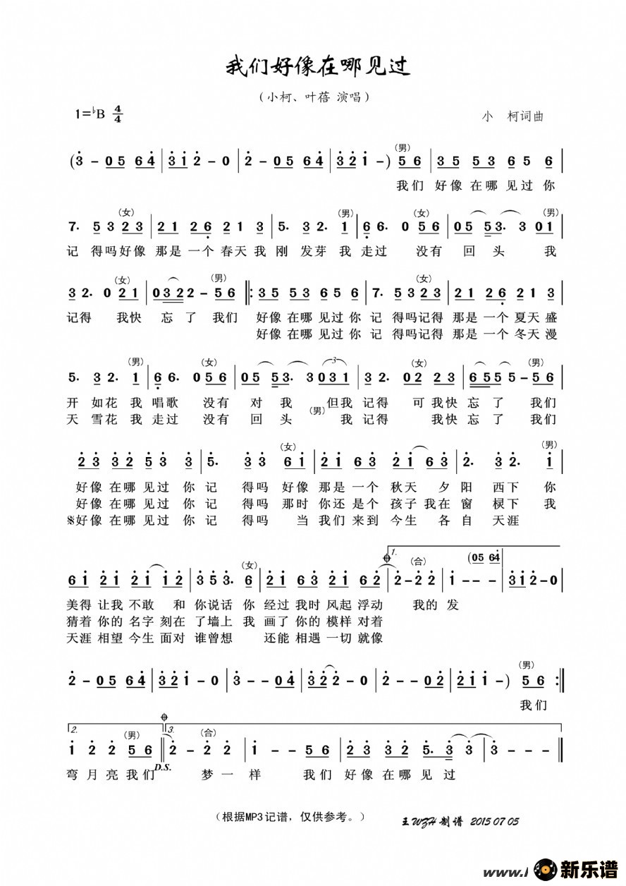《我们好像在哪见过》最新曲谱 叶蓓、小柯