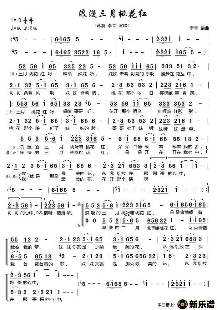 蒋婴、李青演唱的浪漫三月桃花红(最新单页版)歌词,浪漫三月桃花红(最新单页版)最新曲谱.