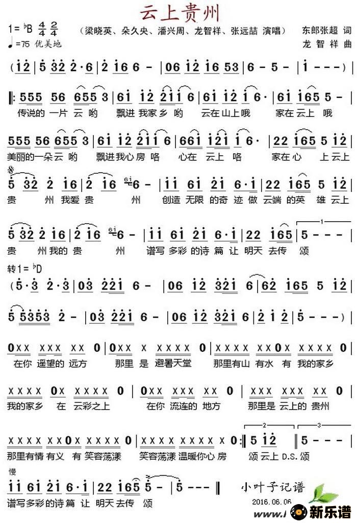 《云上贵州 》最新曲谱 梁晓英、朵久央、潘兴周、龙智祥、张远喆-小叶子制谱