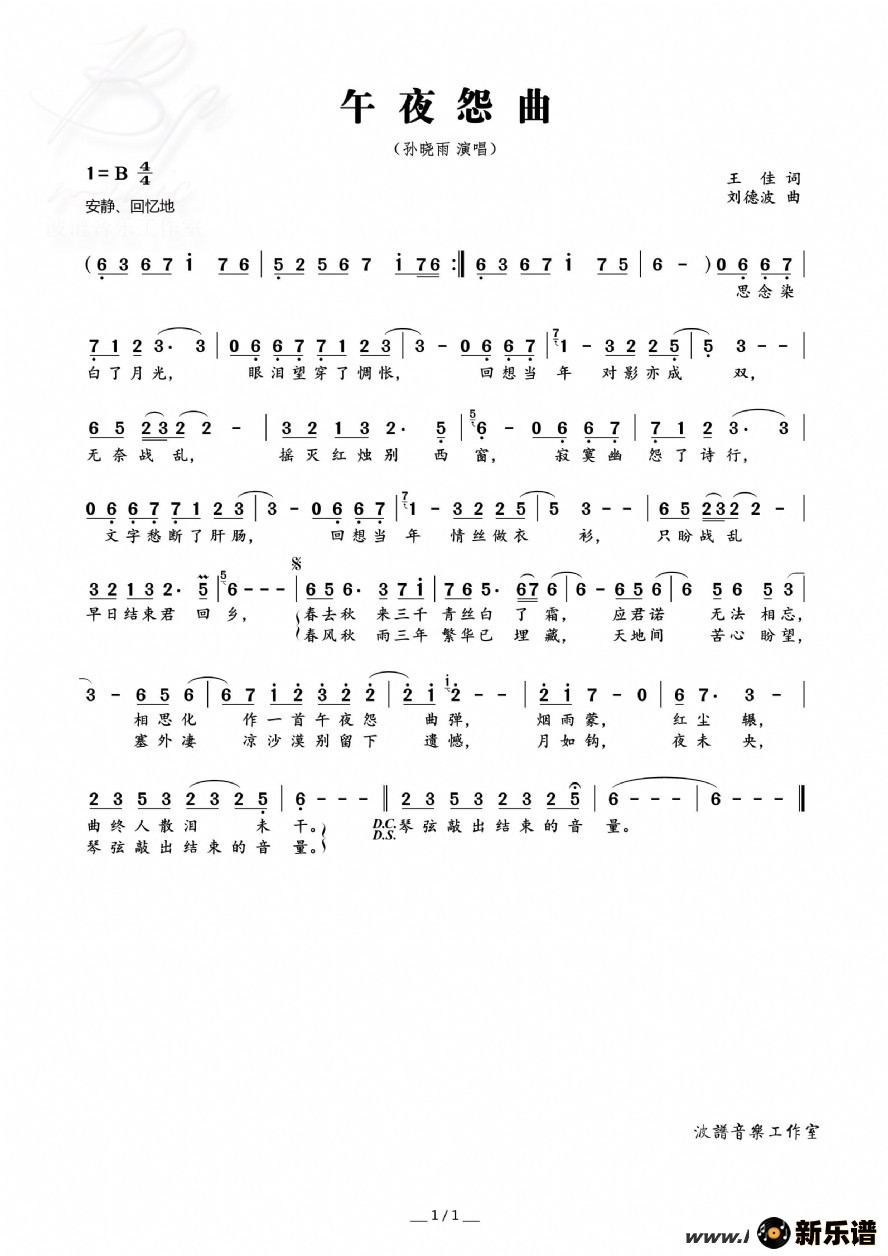 孙晓雨演唱的午夜怨曲歌词,午夜怨曲最新曲谱.