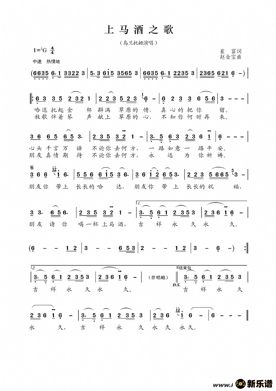乌兰托娅演唱的上马酒之歌歌词,上马酒之歌最新曲谱.