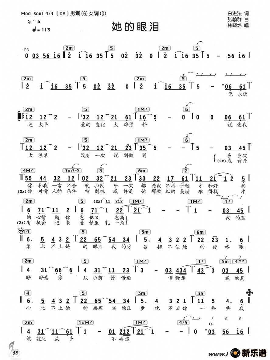 林晓培演唱的她的眼泪歌词,她的眼泪最新曲谱.