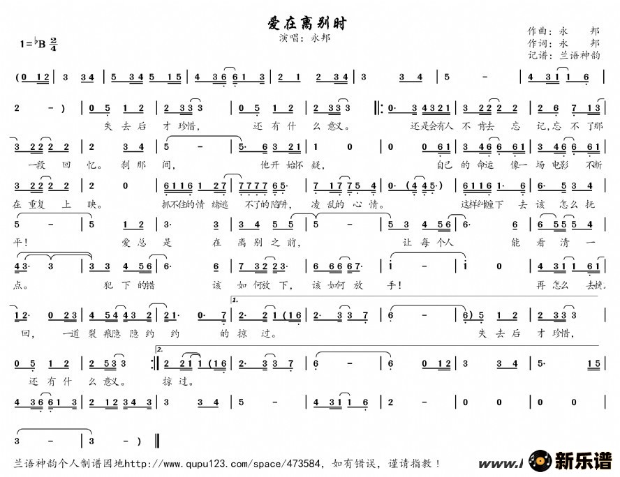 《爱在离别时(电视剧《爱在离别时》主题曲)》最新曲谱 永邦-兰语神韵制谱
