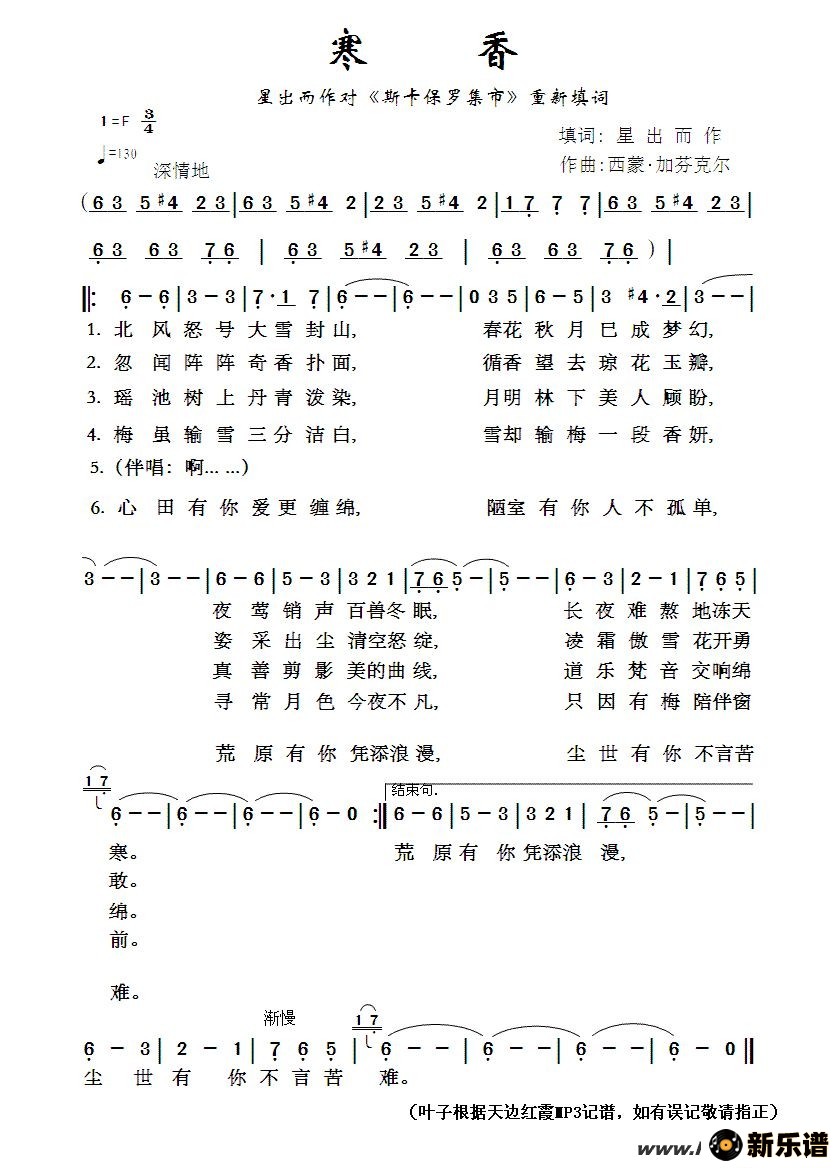 《寒香》最新曲谱 天边红霞