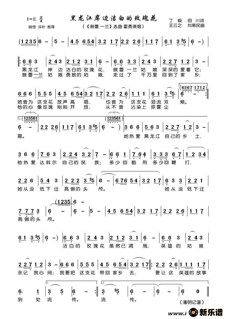 《黑龙江岸边洁白的玫瑰花》最新曲谱 霍勇