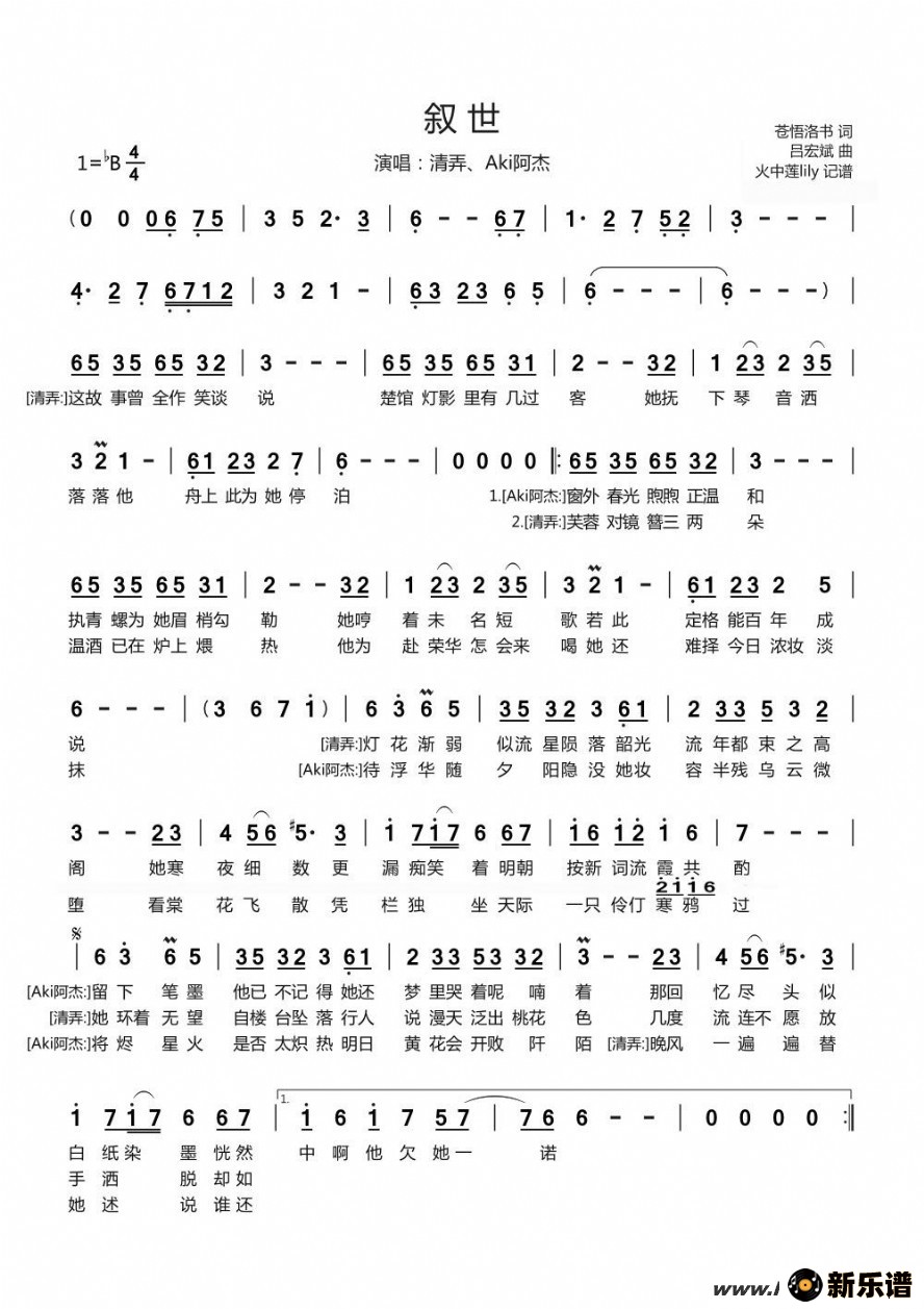 清弄、Aki阿杰演唱的叙世歌词,叙世最新曲谱.