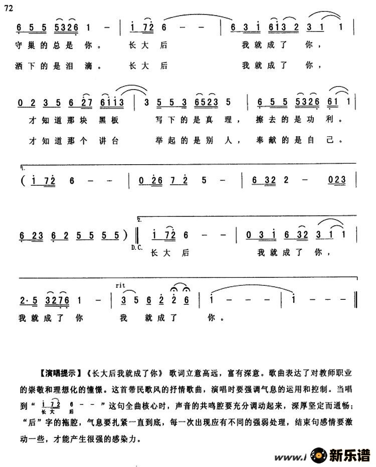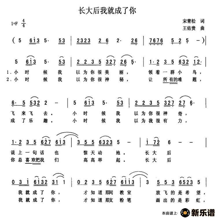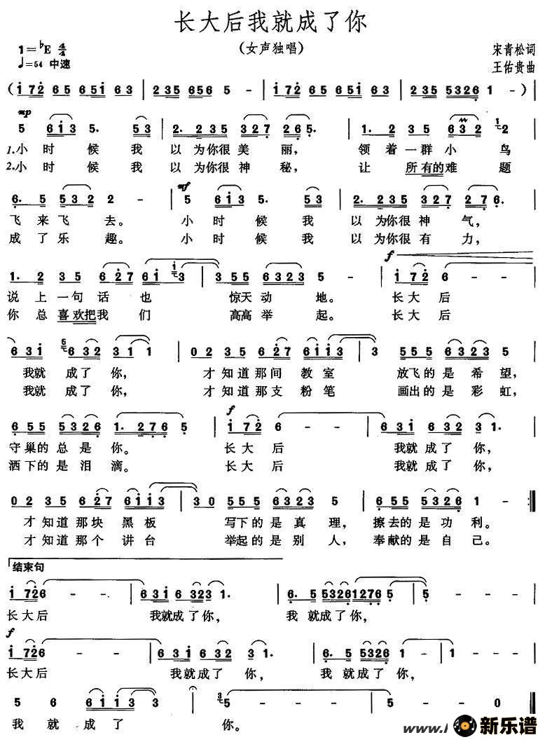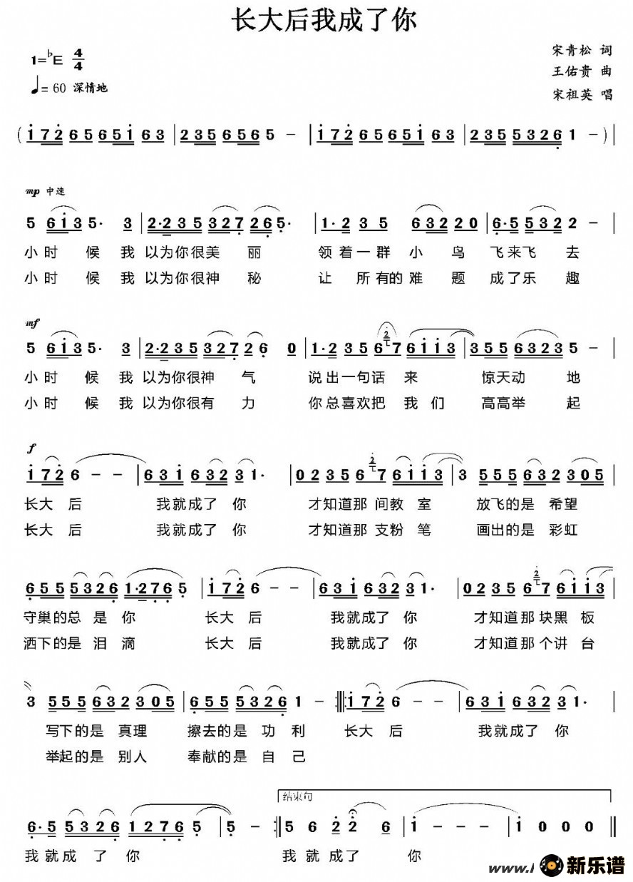 宋祖英演唱的长大后我就成了你歌词,长大后我就成了你最新曲谱.