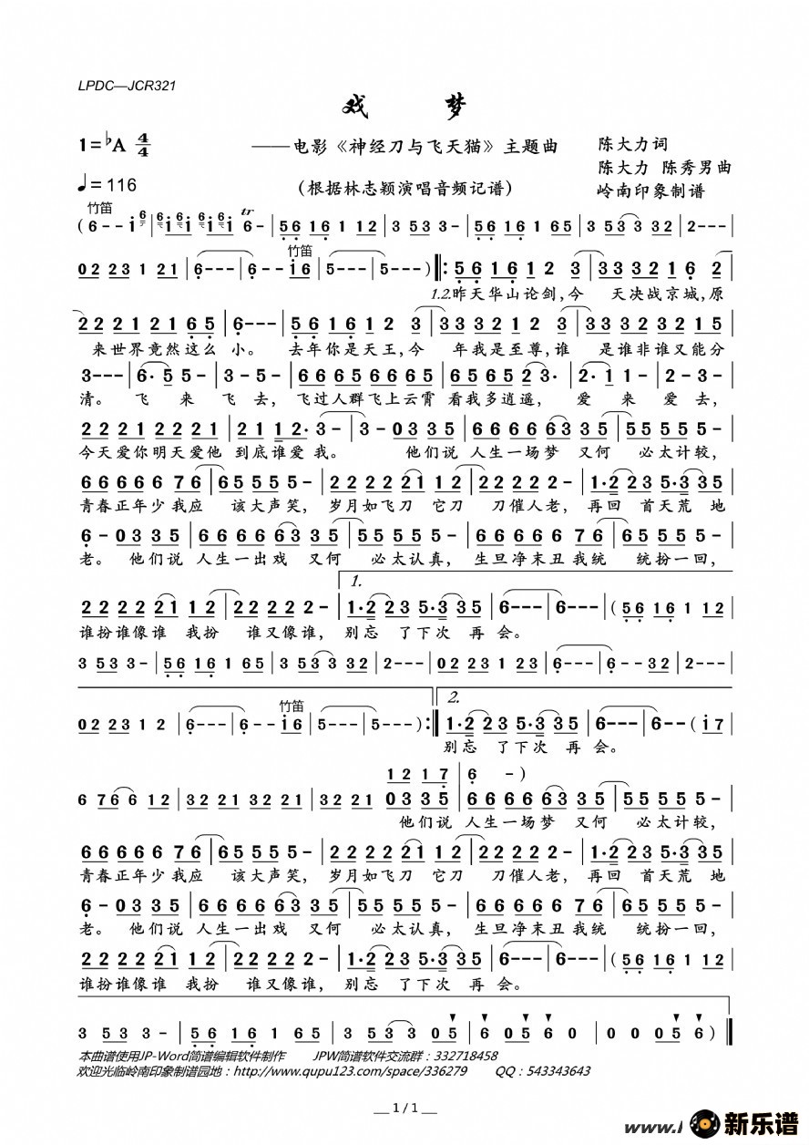 《戏梦(电影《神经刀与飞天猫》主题曲)》最新曲谱 林志颖-岭南印象制谱