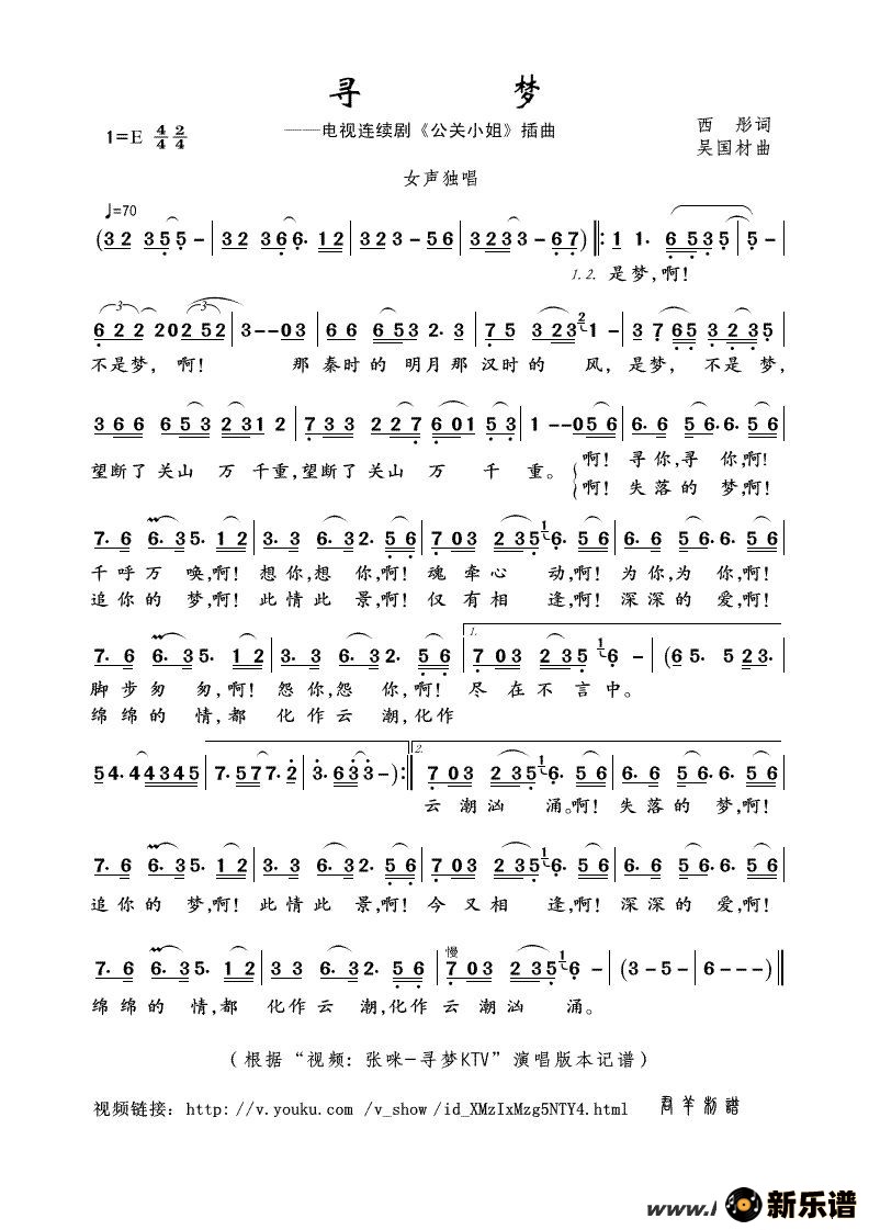 张咪演唱的寻梦歌词,寻梦最新曲谱.