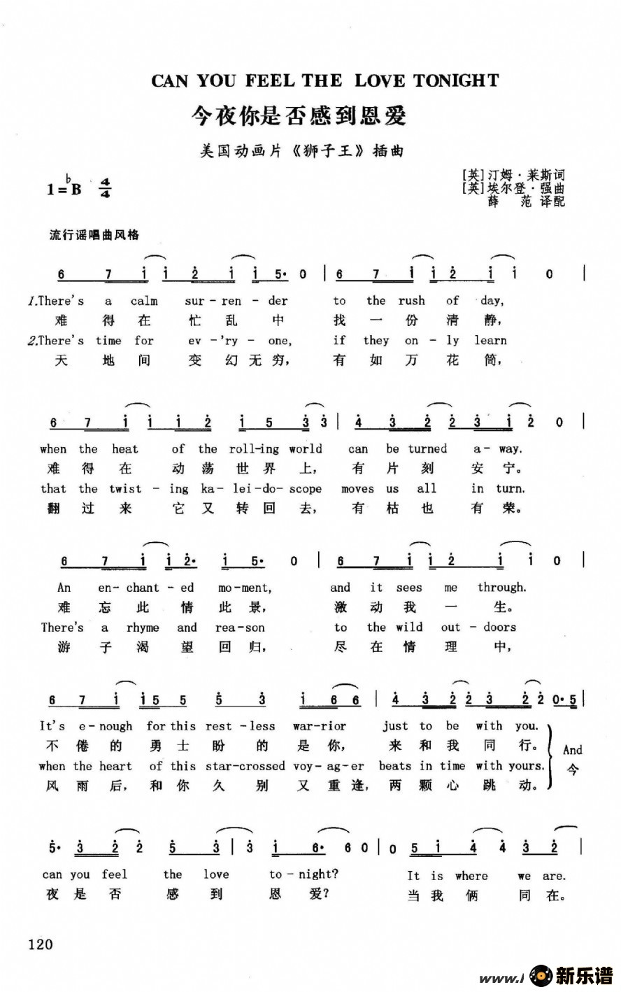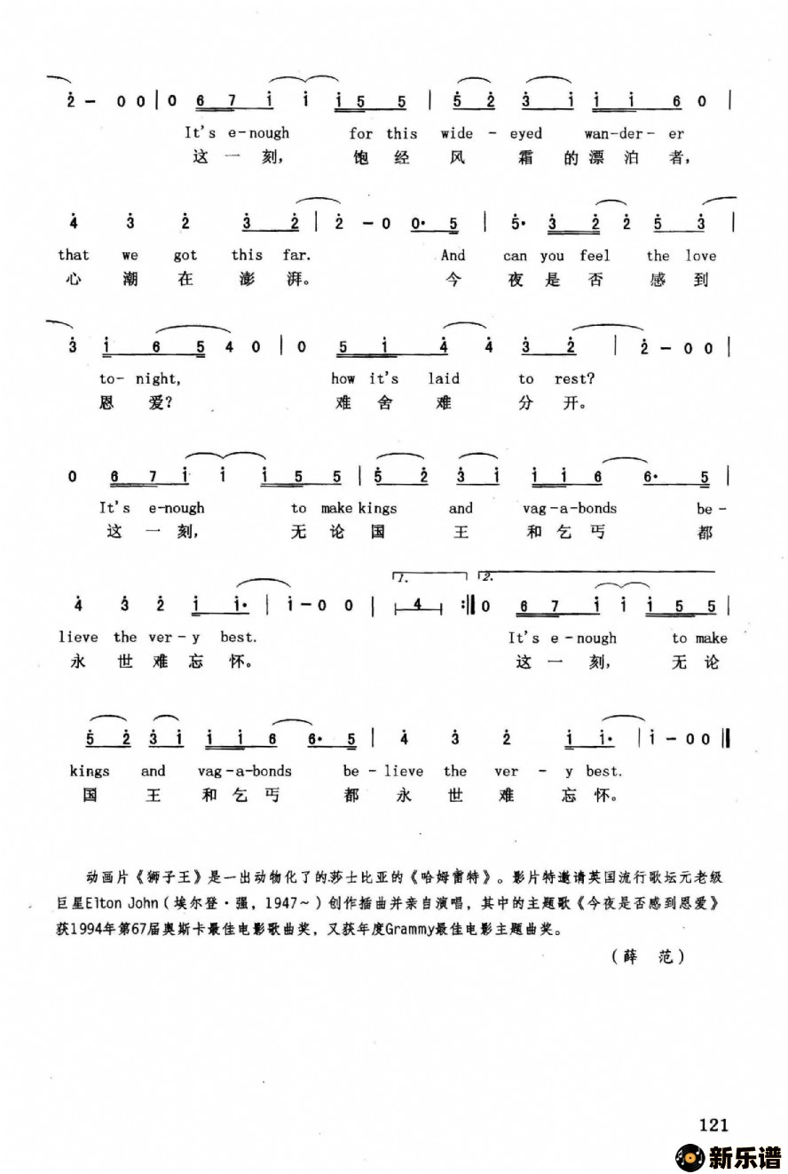 今夜你是否感到恩爱(美国动画片《狮子王》插曲)最新曲谱
