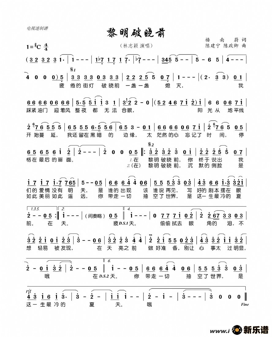《黎明破晓前》最新曲谱 林志颖