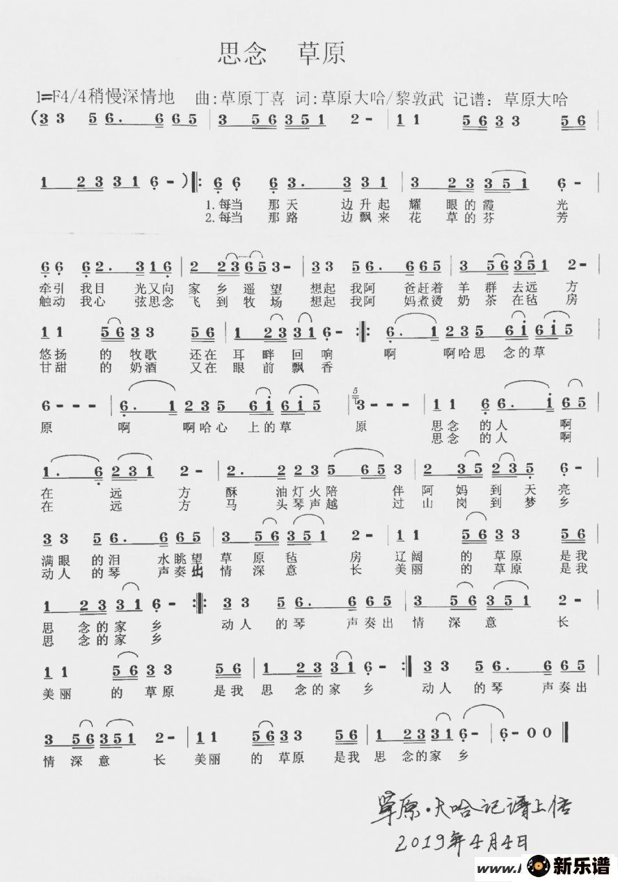 《思念草原》最新曲谱 草原丁喜