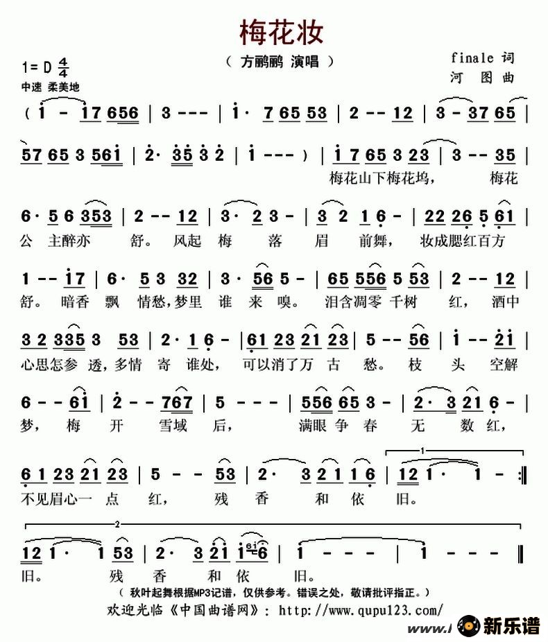 方鹂鹂演唱的梅花妆歌词,梅花妆最新曲谱.