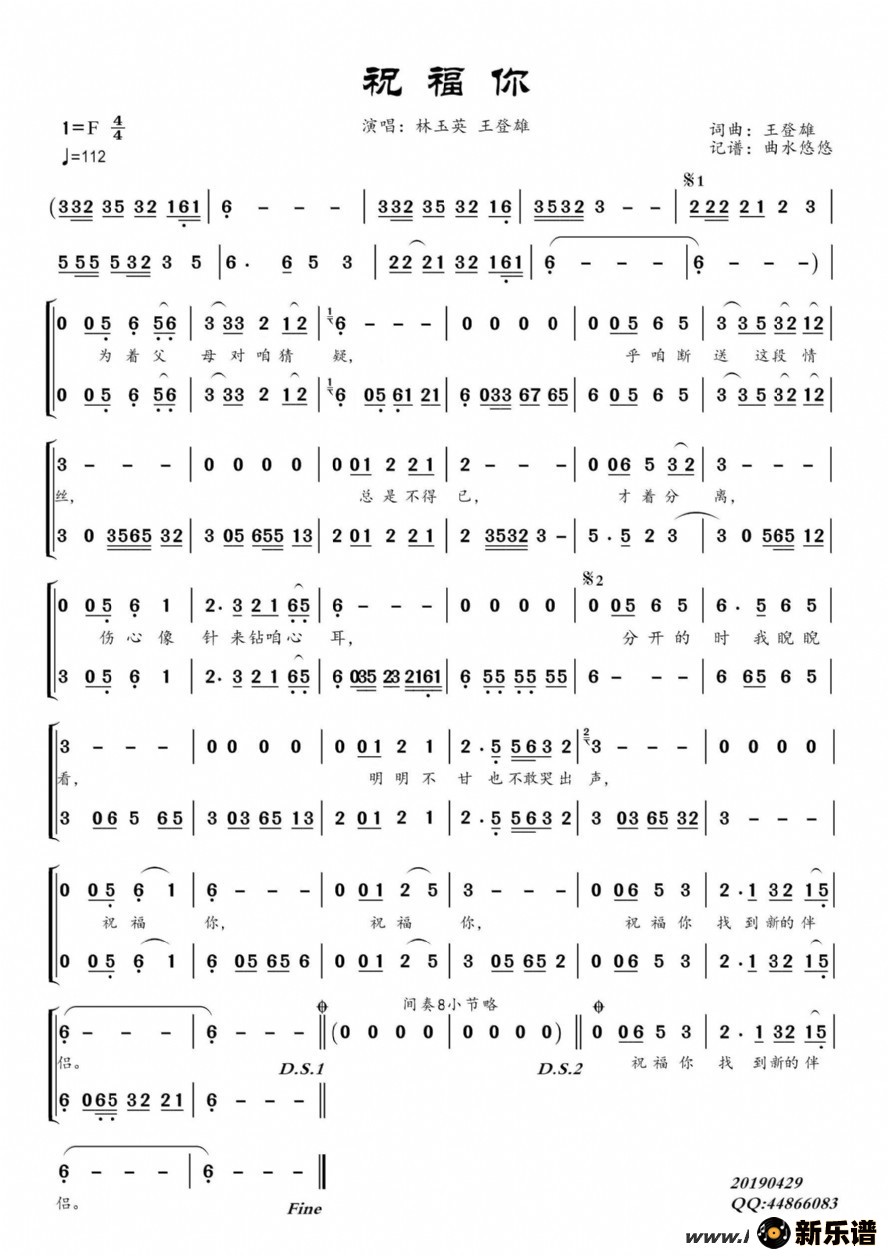 《祝福你》最新曲谱 林玉英、王登雄-曲水悠悠制谱