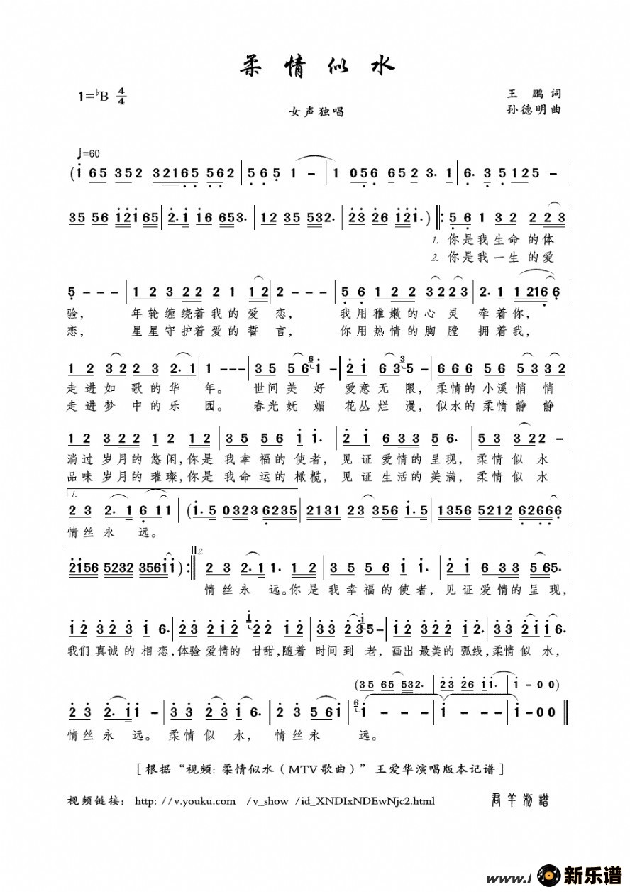 王爱华演唱的柔情似水歌词,柔情似水最新曲谱.