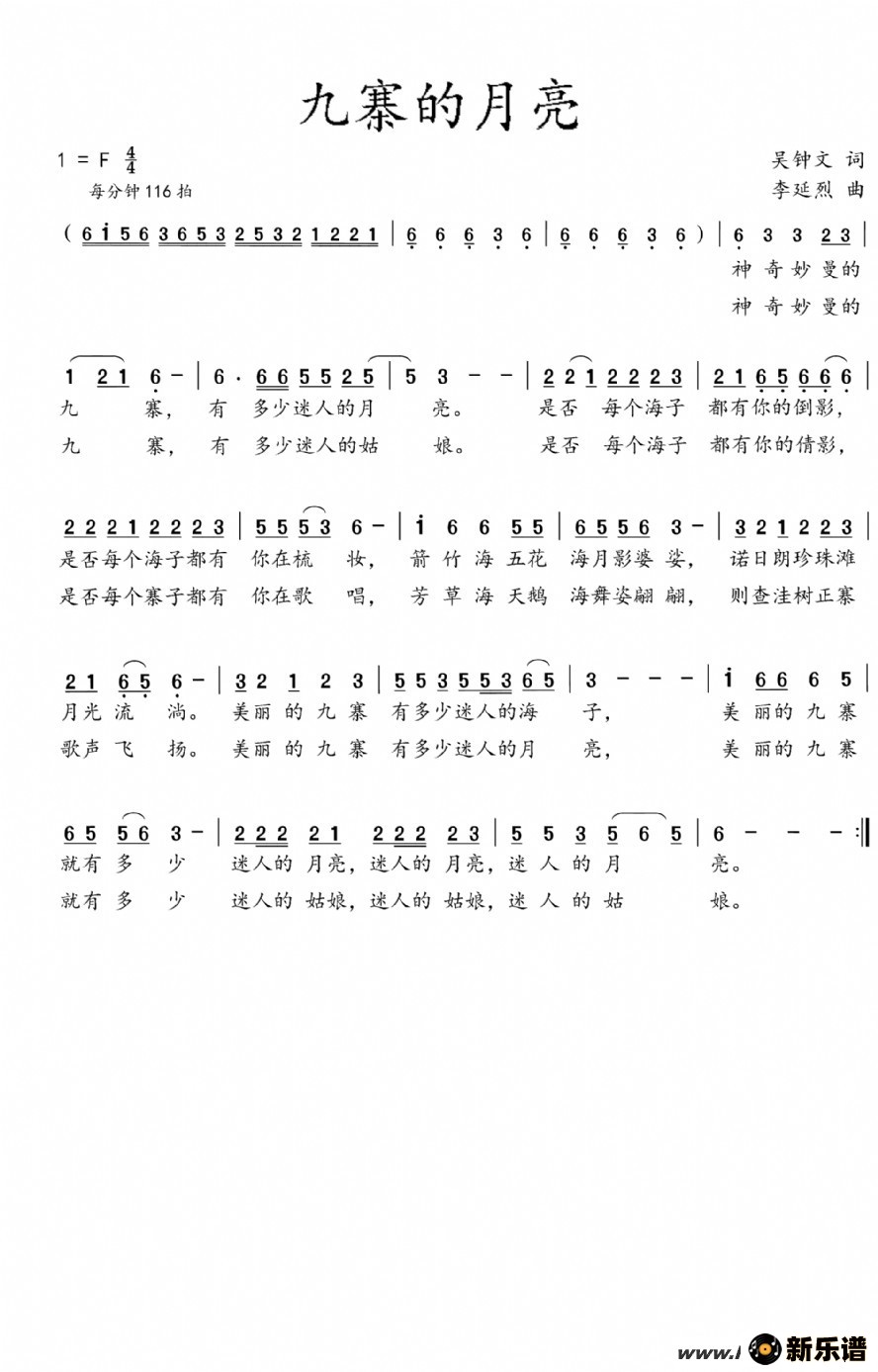 未知演唱的九寨的月亮歌词,九寨的月亮最新曲谱.