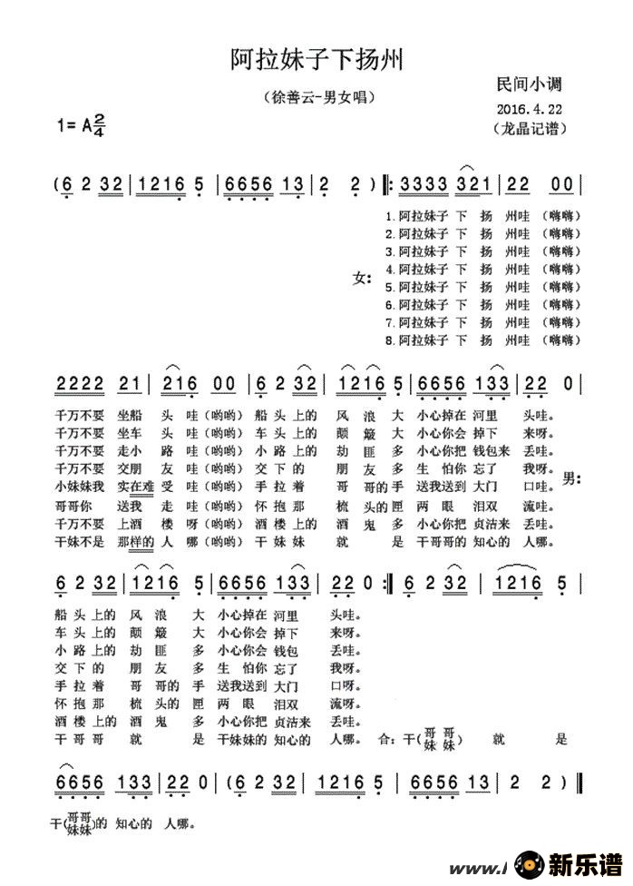 《阿拉妹子下扬州 》最新曲谱 徐善云