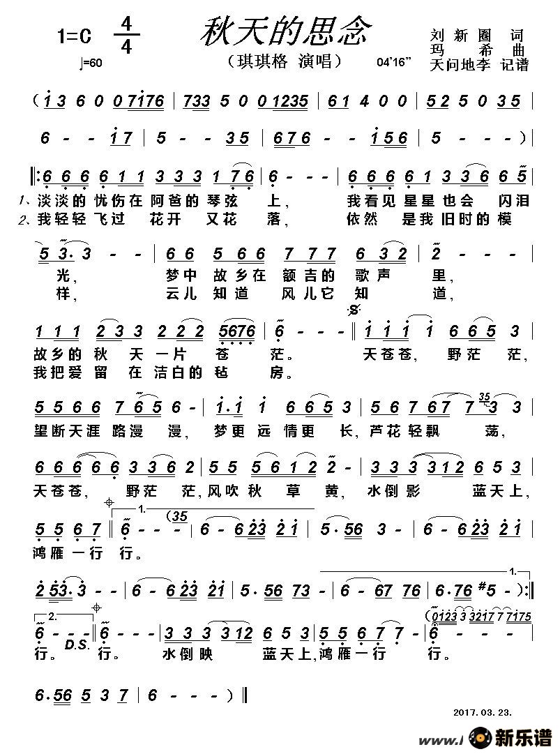琪琪格演唱的秋天的思念歌词,秋天的思念最新曲谱.