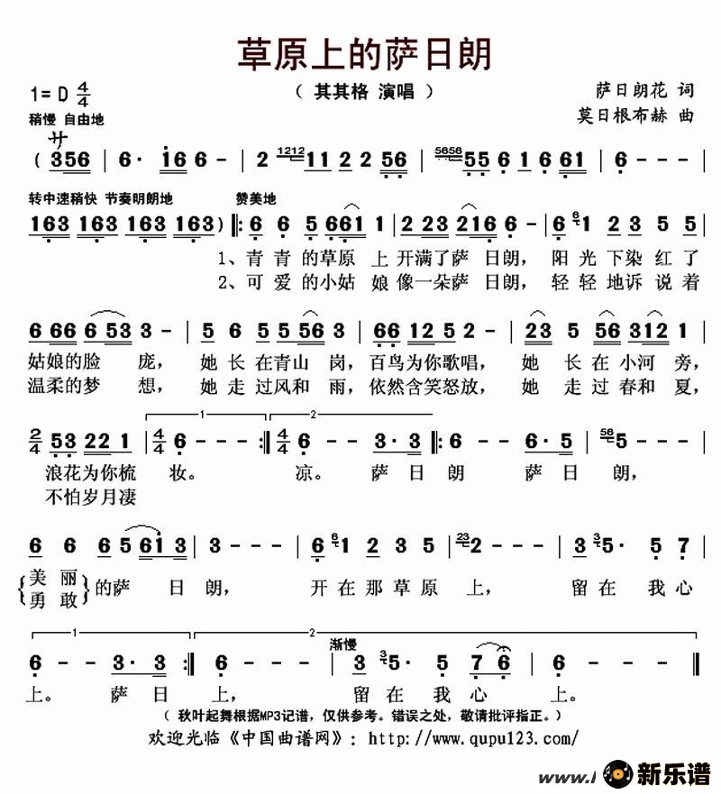 《草原上的萨日朗》最新曲谱 其其格-秋叶起舞制谱