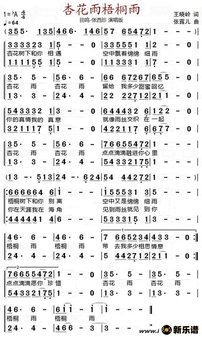 田鸣/张西珍演唱的杏花雨梧桐雨歌词,杏花雨梧桐雨最新曲谱.